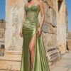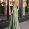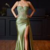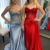 A spaghetti strap satin mermaid prom dress designed to highlight curves with a smooth, elegant finish.